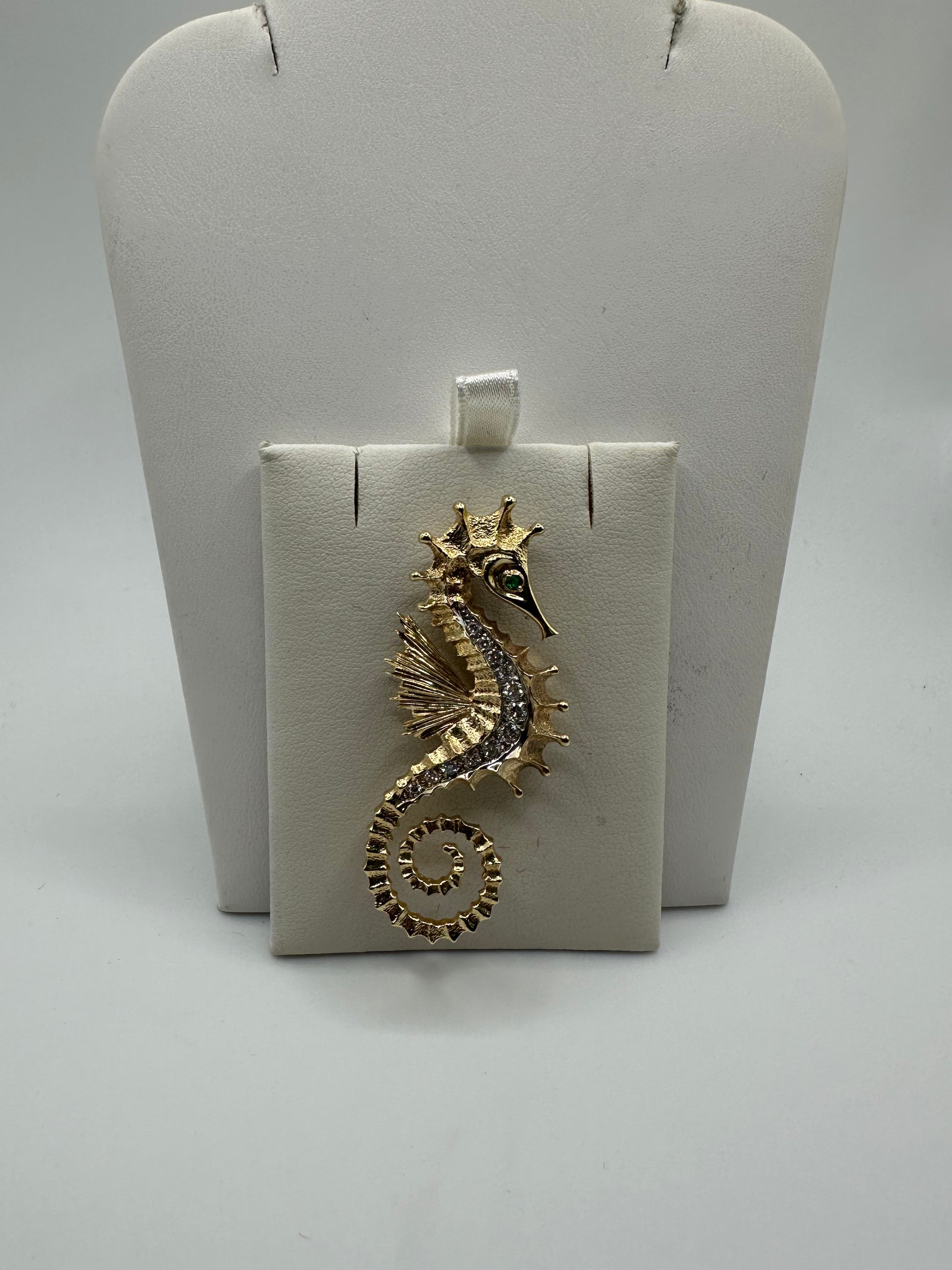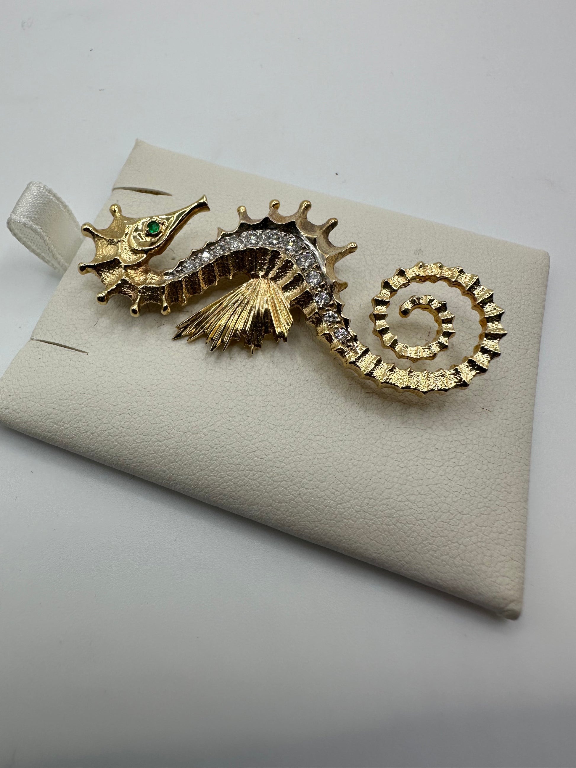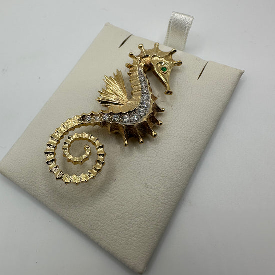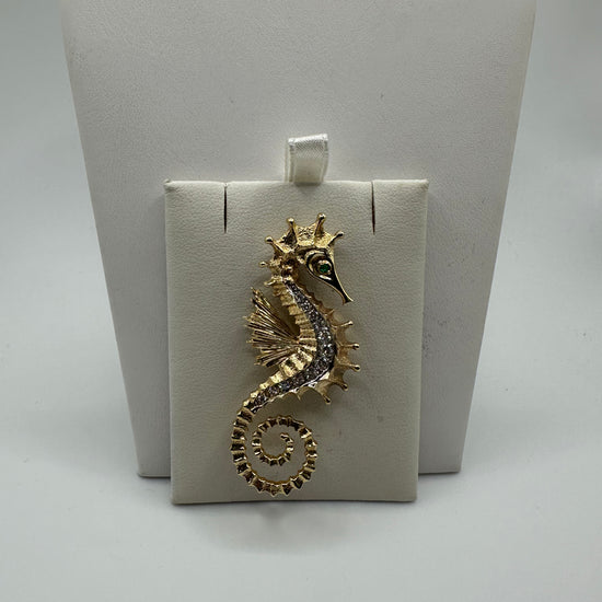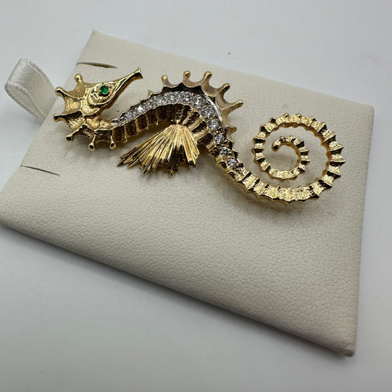 A refined seahorse brooch crafted in 14K gold with 0.50 carats of VS1 diamonds. This nautical-themed piece weighs 11.9 grams and showcases superior diamond clarity. Perfect for adding coastal elegance to your jewelry collection.